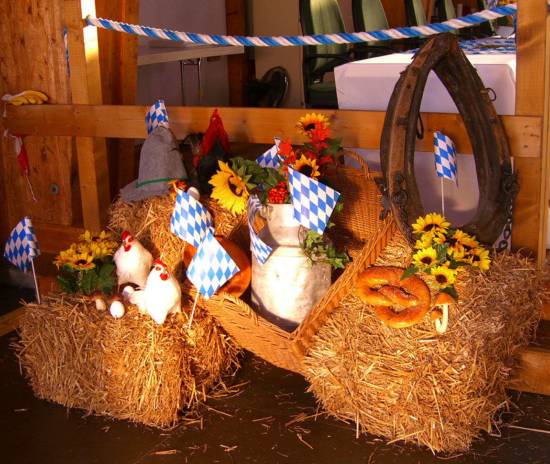 - Verschiedenes: Fahnen, Fähnchen, Bänder, Girlanden, Rechen, Sense, alte Tische, Zaun, Spinnrad, Bierkrüge, Hüte, und vieles mehr