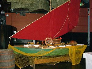 Feindeko: Flaggen, Liegestühle, Südfrüchte und Gemüse oder Käse, Schinken und Salami (alles künstlich), Weinranken, Korbflaschen, Fische, Netze, Hüte, Schwimmreifen, Steuerruder, Anker, Seile, Madonna-Figur etc.